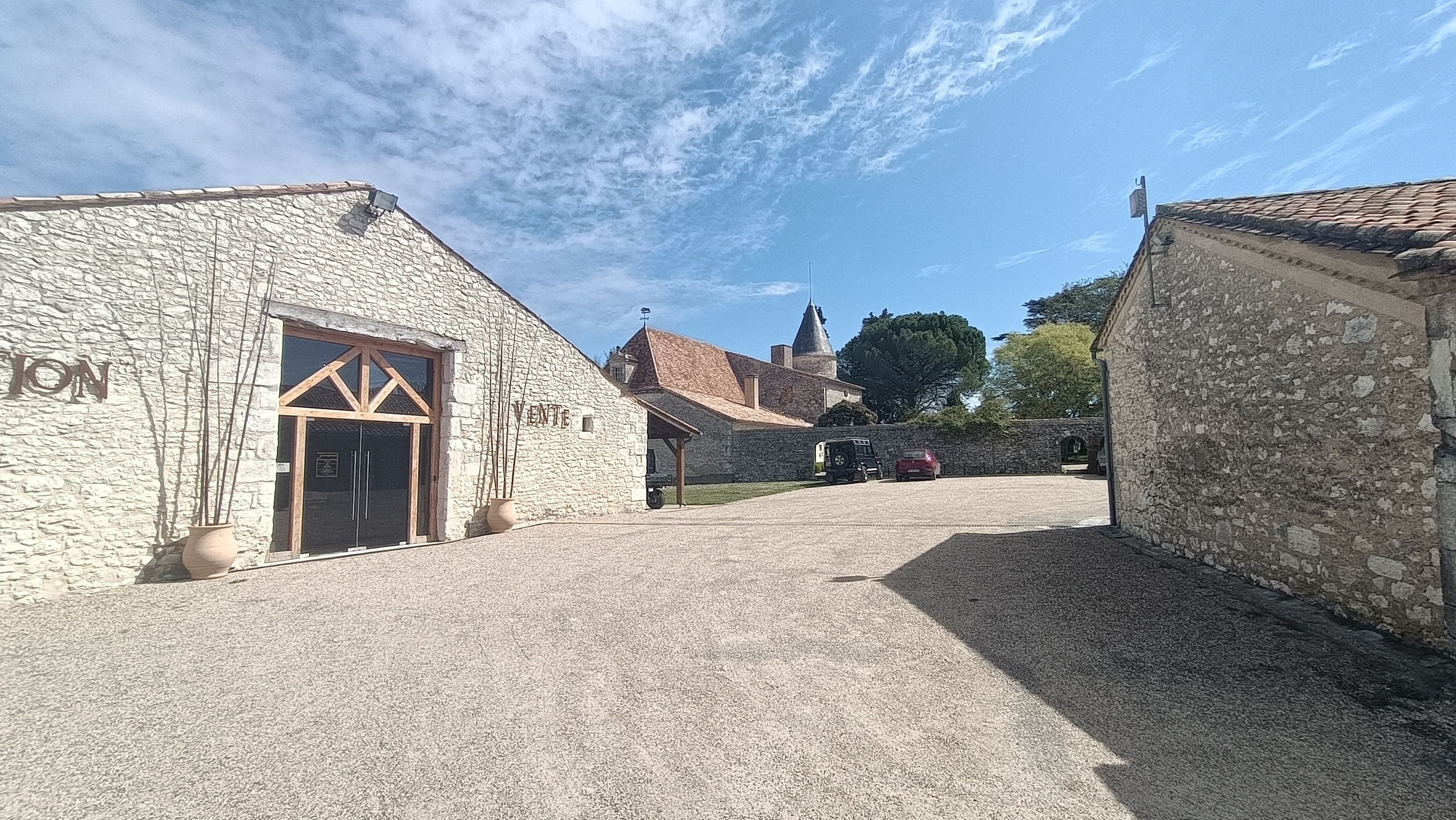 Cave biologique absolument incroyable avec des propriétaires extraordinaires qui ont combiné les dernières technologies tout en restaurant des bâtiments historiques. Comprend une brocante (magasin d'antiquités), des salles de dégustation, un café et bien sûr un caviste. Il y a aussi un pigonnaire, une église catholique privée, une maison privée et des jardins. 50 acres/125 hectares.